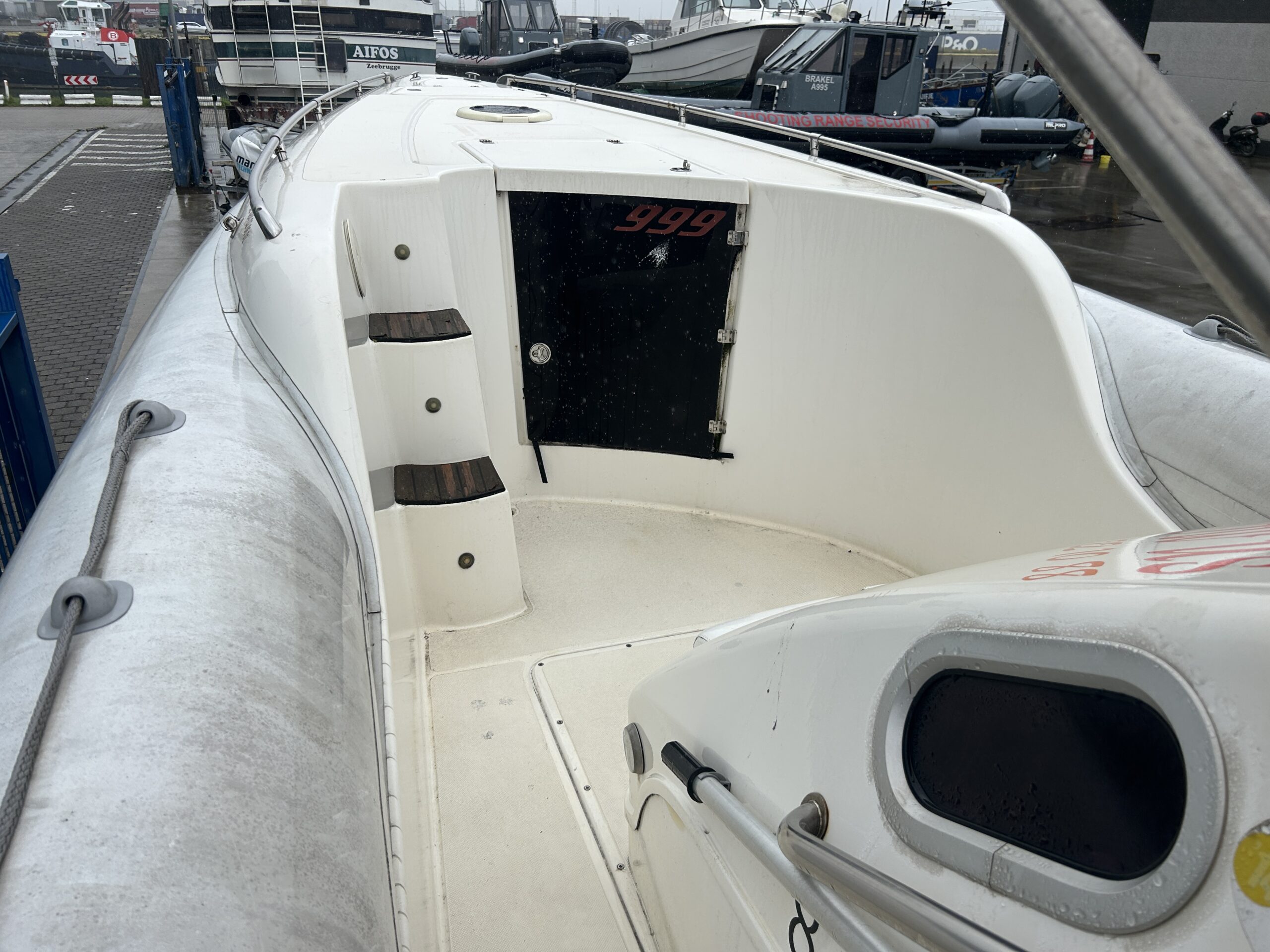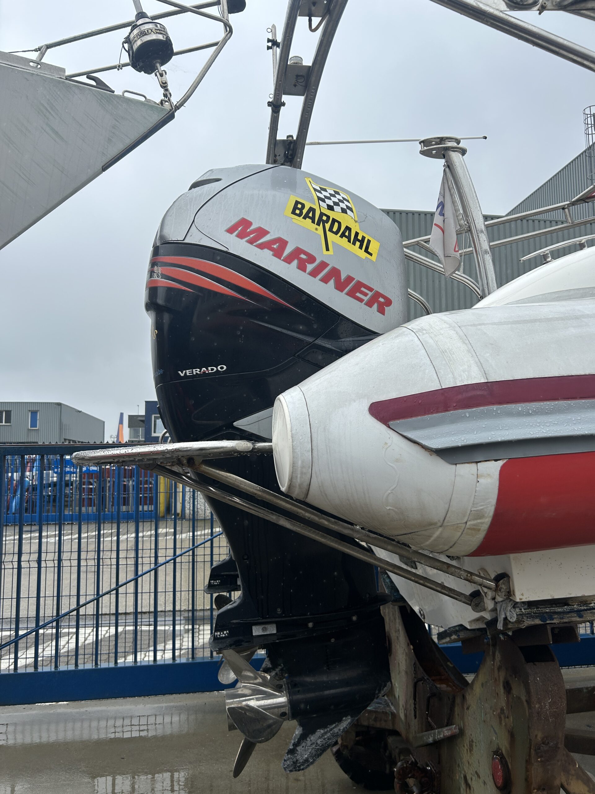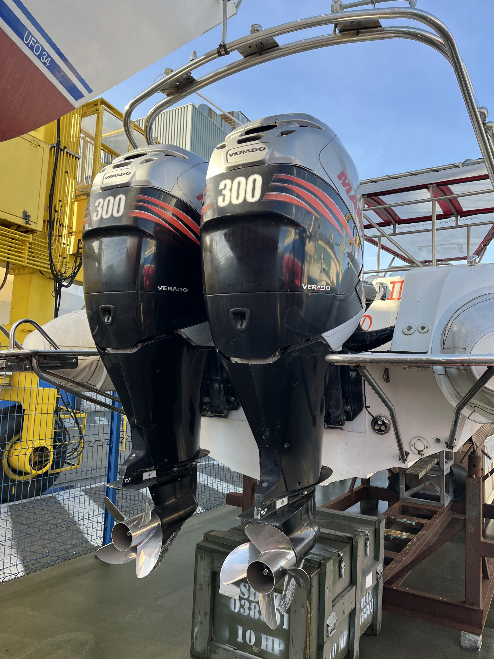 Max. vermogen: 2 x 500pk, huidige RHIB is voorzien van twee Mariner 300pk motoren van 2008.